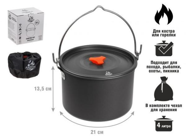 Котелок туристический расчитан на 4 л., изготовлен из пищевого алюминия обладает высокой прочностью и долговечностью.