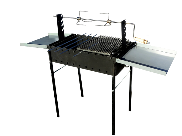 - Мангал сборно-разборный. Комплектация - шампур-5шт.,подставка под казан-1шт.,вертел-1шт.,решетка для барбекю-1шт. Покрытие:жаровня - краска термостойкая,черная;крышки,ножки - краска порошковая.