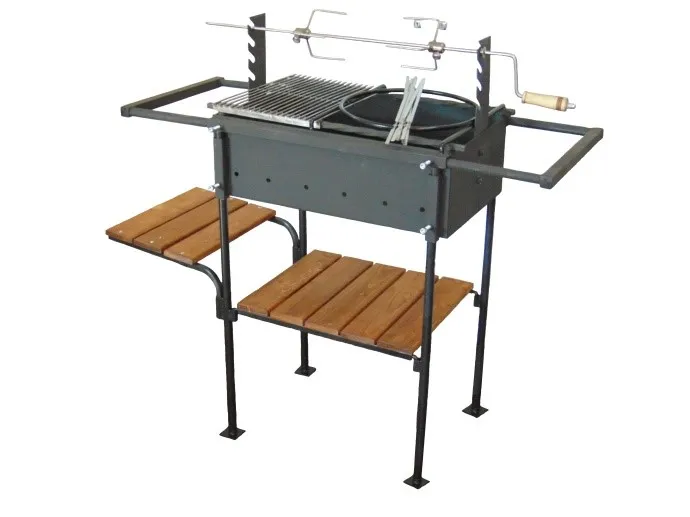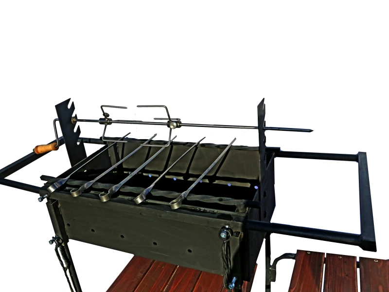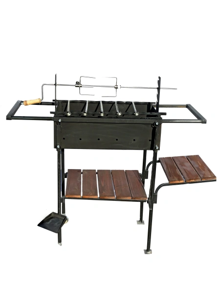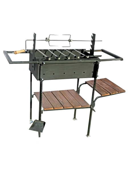 - Мангал сборно-разборный. Покрытие:жаровня - краска термостойкая,черная;ножки - краска порошковая,планки покрыты морилкой. Конструкцией предусмотрена возможность регулирования опор для шампуров по высоте относительно дна корпуса от 200 мм. до 260 мм. Опоры для укладки шампуров выполнены из скрученного стального квадрата 12х12 мм. В комплект входит: шампур-5шт., решетка для барбекю-1шт., подставка под казан-1шт., вертел-1шт..