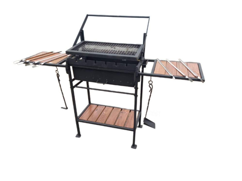 - Жаровня – сталь толщиной 2 мм. Комплектация – совок, кочерга, 6 шампуров. Покрытие: жаровня – краска термостойкая, черная; остальные части мангала покрашены порошковой краской, черная.