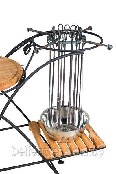Конструкция является функциональным многоярусным изделием с подставкой для крышки от тандыра, столешницей, разделочной доской и круглой перекладиной для подвешивания необходимых аксессуаров для готовки.
