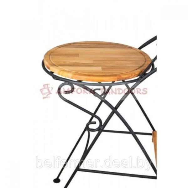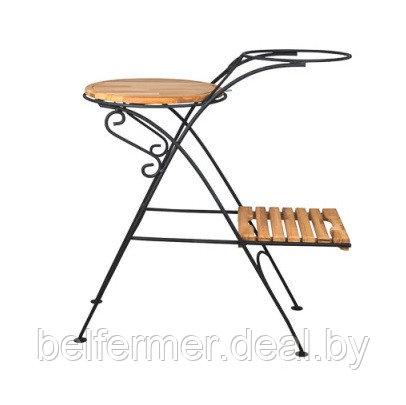 Основные фрагменты стойки выполнены из кованого металла, и украшены декоративными завитками. В качестве материала для столешницы и доски - натуральный бук.