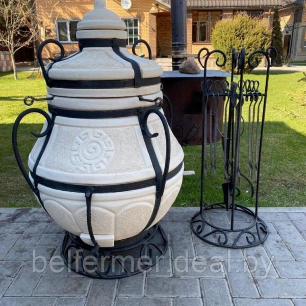 Тандыр "Аладдин" ― это последняя разработка самого популярного производителя тандыров, компании "Амфора". О нем можно говорить только в превосходной степени! Настоящий тандыр является самым большим и универсальным, и предназначен для приготовления всех видов блюд: на шампурах, крюках, решетках и стенках, а также в сковородах, воках и чугунках. По утверждению профессионалов в нем можно приготовить до 26 лепешек за раз, в то время как в Восточном тандыре только 20 (количество лепешек зависит от их диаметра и профессионализма повара.