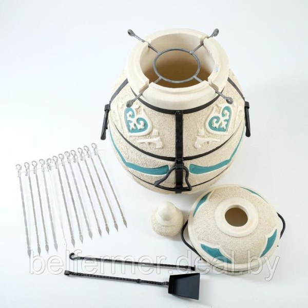 Двенадцать длинных кованых шампуров способных удержать по килограмму (и даже больше!) мяса каждый и оригинальная конструкция самой печи позволяют приготовить горы отличного шашлыка за несколько минут. При этом за счет усиленной конструкции и большей толщины стенок жар внутри тандыра спадает не ранее чем через три часа после первой закладки, что позволяет приготовить несколько разных блюд в любой последовательности, или просто накормить целую свадьбу вкусным свежеприготовленным шашлыком за считанные минуты!