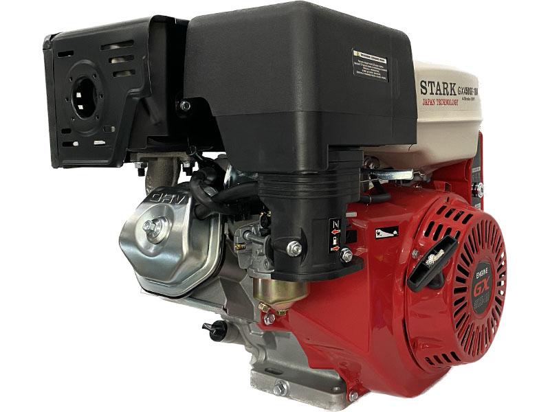 Бензиновый двигатель модели Stark GX450 SE 18A воздушного охлаждения со шлицевым валом диаметром 25мм (6шлицов), OHV, мощностью 18,0 л.с., гильзованный, с высоким моторесурсом. Рекомендуем приобретение этого двигателя для установки на тяжелые мотоблоки и мотокультиваторы. В данном двигателе установлена система аварийного отключения двигателя при низком уровне масла. Запуск двигателя осуществляется ручным или электрическим стартером. Катушка освещения 18Ампер позволяет подключать осветительные приборы и прочие потребители мощностью до 216 Вт.