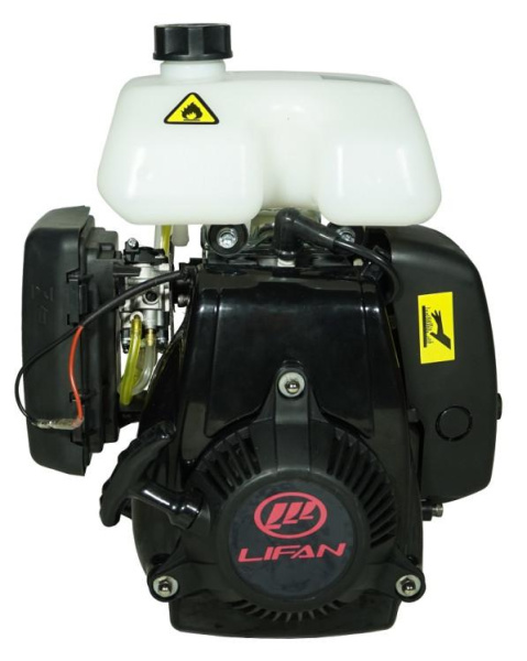 Двигатель Lifan 144F оснащен ручным стартом и не имеет катушки освещения. Система зажигания - бесконтактное электронное управление. Величина оборотов холостого хода составляет 2000 ±150 об/мин. Система подачи топлива - карбюратор. Редуктор отсутствует.