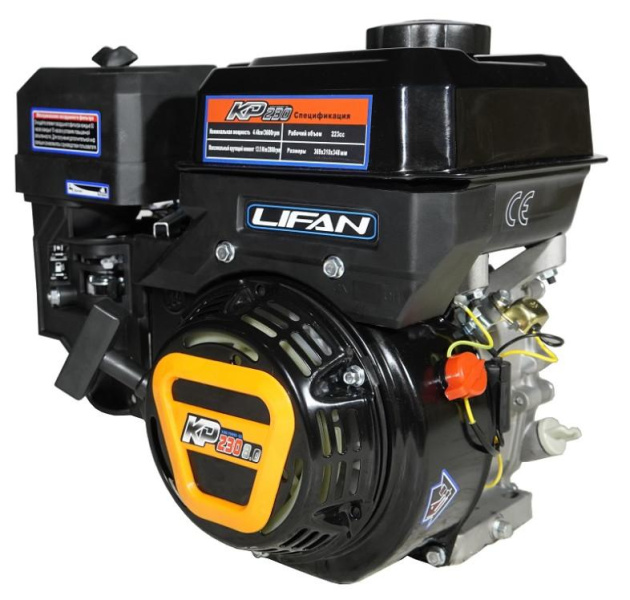 Большой охлаждающий плавник в основании картера для эффективной теплоотдачи.Производитель Lifan Тип двигателя Бензиновый 4-х тактный одноцилиндровый Расположение вала Горизонтальное Диаметр цилиндра, мм 70 Ход поршня, мм 58 Рабочий объём, см3 223 Степень сжатия 9.5:1 Крутящий момент 13,5 Н.м при 2500 об. в мин. Система зажигания Бесконтактное электронное Запуск Ручной старт Расход топлива, г/кВт*ч 370 Объем масла в двигателе, л 0.6 Катушка освещения Отсутствует Размеры, мм 350х310х350 Размеры упаковки, мм 415х380х380 Емкость топливного бака, л 3.6 Наличие редуктора Отсутствует Диаметр вала, мм 20 Вес(брутто), кг 16.9 Обороты холостого хода, об/мин 1350 (+/-50) Гарантия производителя, мес 24 Система подачи топлива карбюратор Вес (нетто), кг 15,4 Длина вала, мм 50 Тип вала LS type Максимальное количество оборотов/мин 3600 Артикул KP230 (170F-2T)