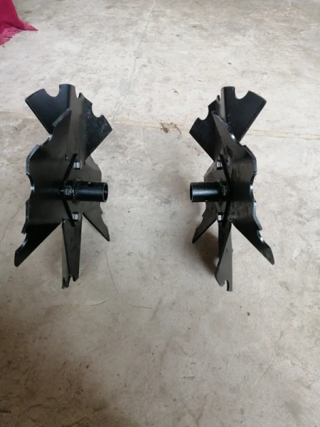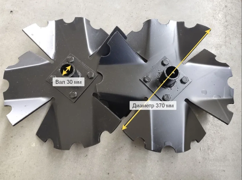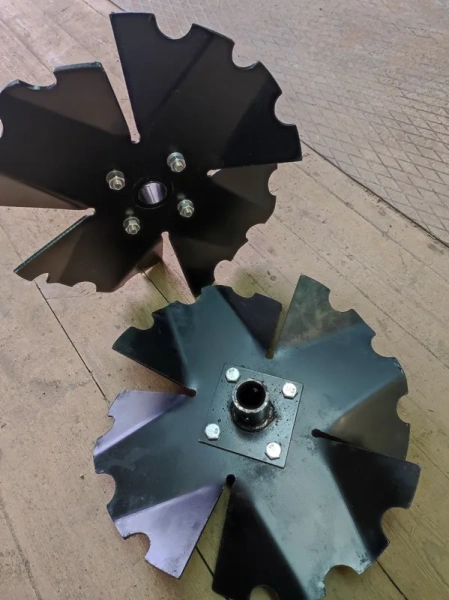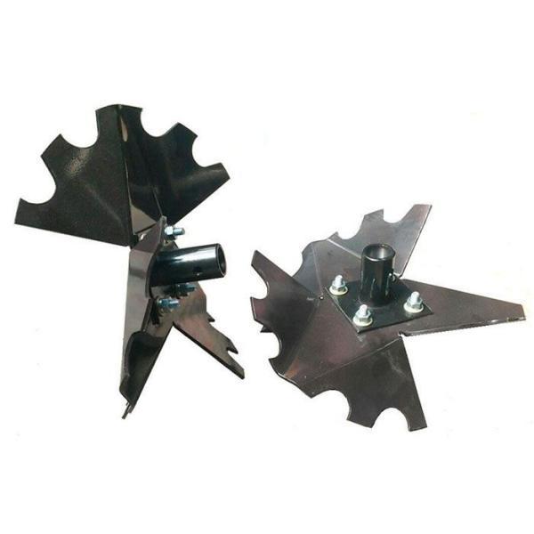 Окучник Ромашка для мотоблока. Устанавливается вместо колес. Благодаря зубчатой форме лопастей окучник агрессивен по отношению к сорнякам и интенсивно вычесывает их из почвы, в том числе и укоренившиеся. При вращении дисков земля закидывается на гребень. Отлично справляется с сорняками.
