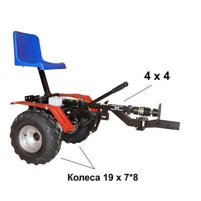 Основное преимущество АMПК-1 перед аналогами – это то, что имеется привод на задние колеса, то есть крутящий момент от двигателя идет к задним колесам. Благодаря этому достигнуто повышенное тяговое усилие. 4 колеса ведущие – по 2 штуки у самого мотоблока и у АMПК-1. Можно сказать, это минитрактор (мототрактор) с колесами. Осуществление привода происходит от нижнего ВОМ. Адаптер оснащен: