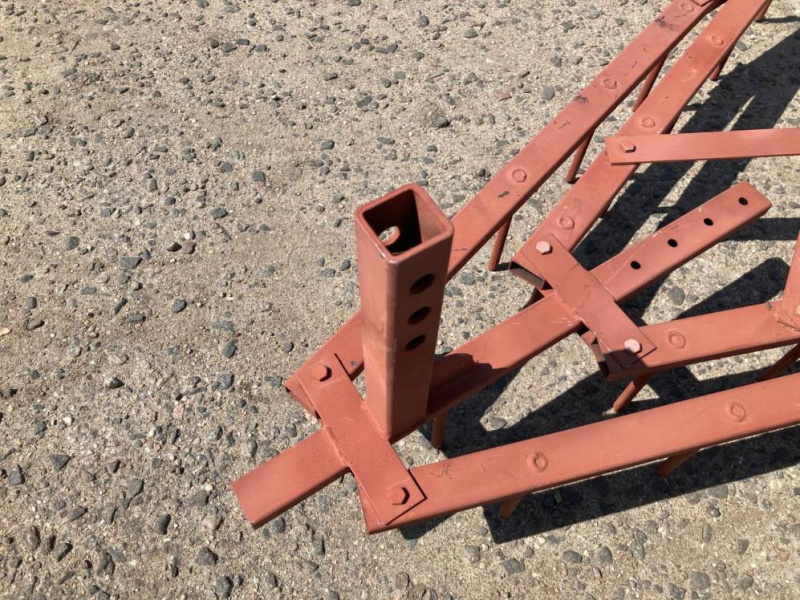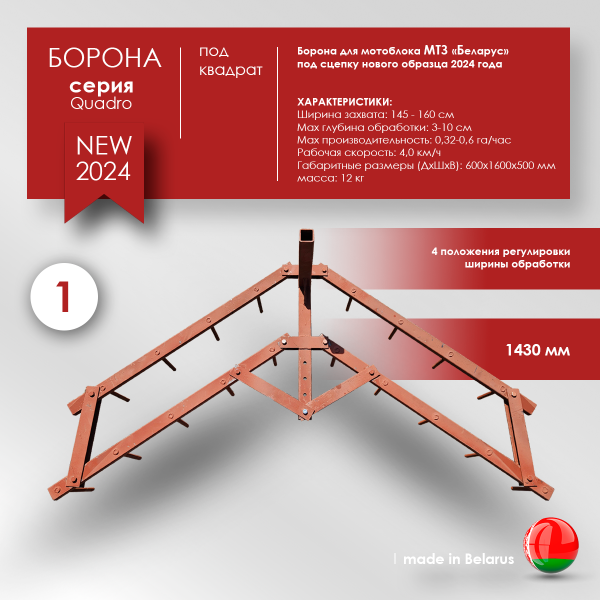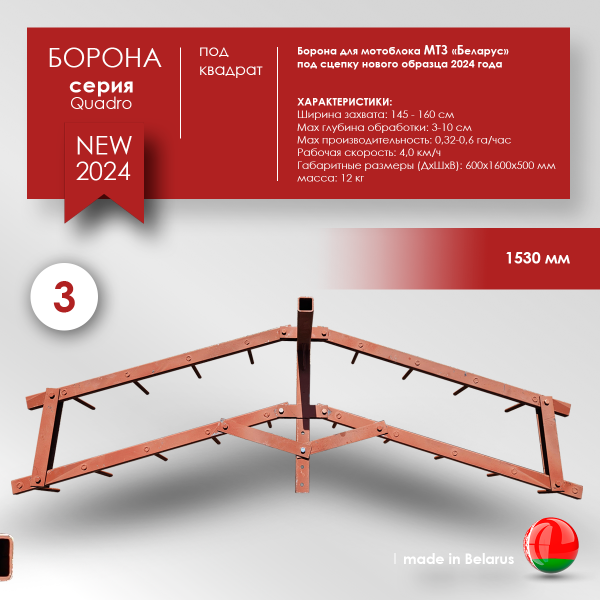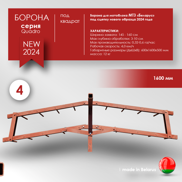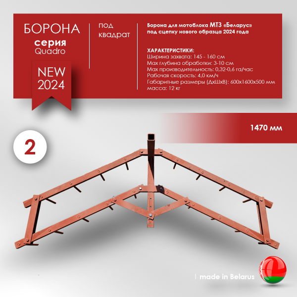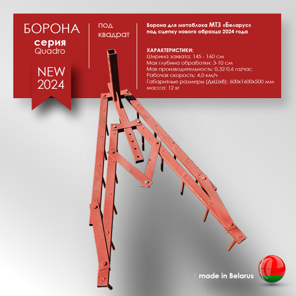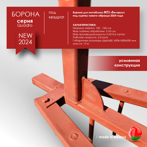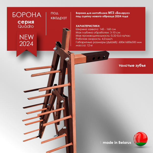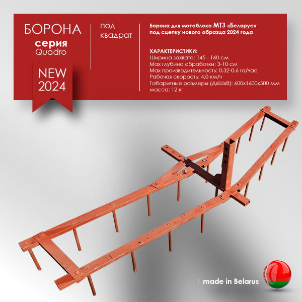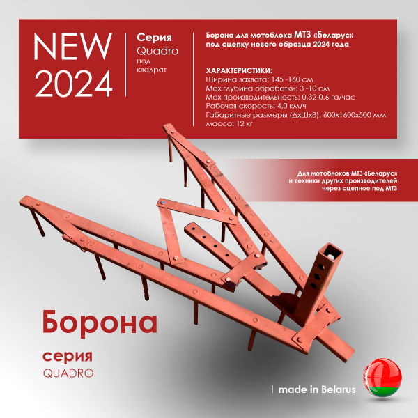 | Борона для мотоблока МТЗ "Беларусь" образца 2024 года. Регулируемая ширина захвата до 1,6 метра, под сморгонскую сцепку. Сельскохозяйственное орудие для поверхностной обработки почвы. Может использоваться как отдельно (например, агрегатироваться с тракторами на сцепках), так и совместно с другими сельхоз орудиями (плугами, сеялками, культиваторами и др.). Боронование предохраняет почву от высыхания, выравнивает её поверхность, разрушает почвенную корку и уничтожает сорняки. |