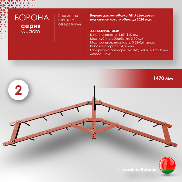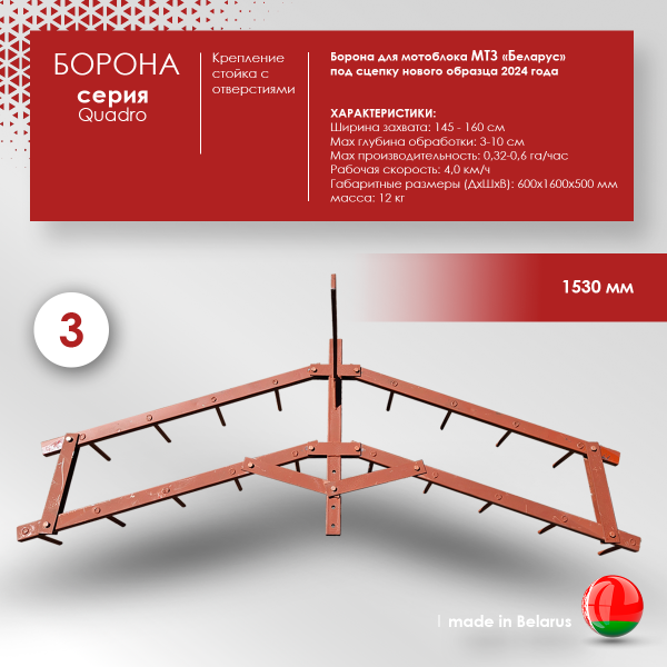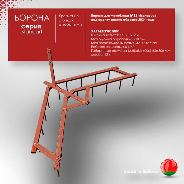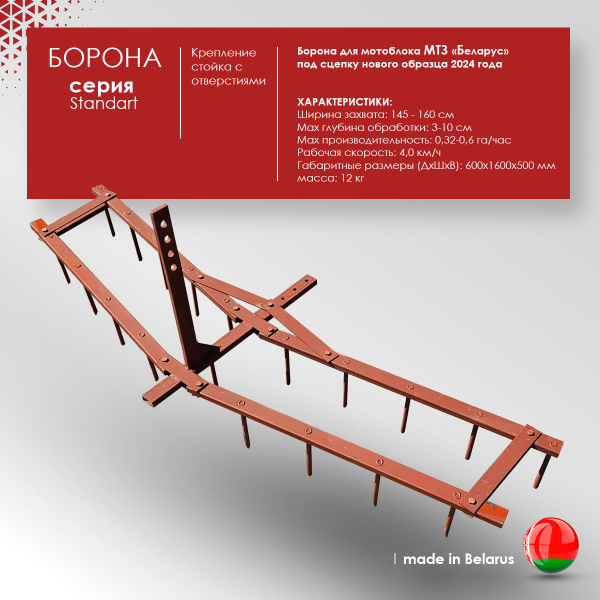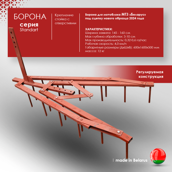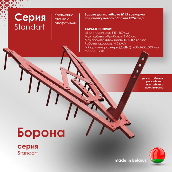 - Борона для мотоблока или культиватора. Подходит ко всем типам мотоблоков китайского или российского производства. Подключается к мотоблоку через сцепку. Глубина обработки регулируется благодаря высокой стойке с отверстиями.