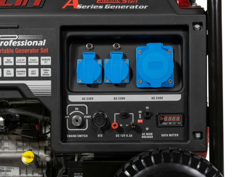 - Генератор оборудован системой автоматического запуска ATS (Automatic Transfer Switch), в России по стандарту эта система называется АВР (автомат ввода резерва). В случае отключения входного напряжения данная система автоматически запускает генератор. Блок управления АВР поставляется отдельно. Генератор оснащен большими колесами и удобными складными ручками, что позволяет без особенных усилий перемещать его в нужное место даже одному человеку.