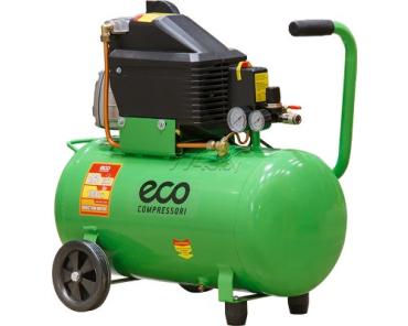 Компрессор ECO AE-501-4 Уровень масла должен быть немного выше верхней границы красной точки на глазке. Требует дозаправку маслом. Регулятор давления. 2 выхода (быстросъем и кран с переходником). Воздушный фильтр с поролоновым фильтроэлементом. Манометры с пластиковым корпусом. Колеса с резиновыми накладками.
