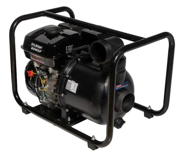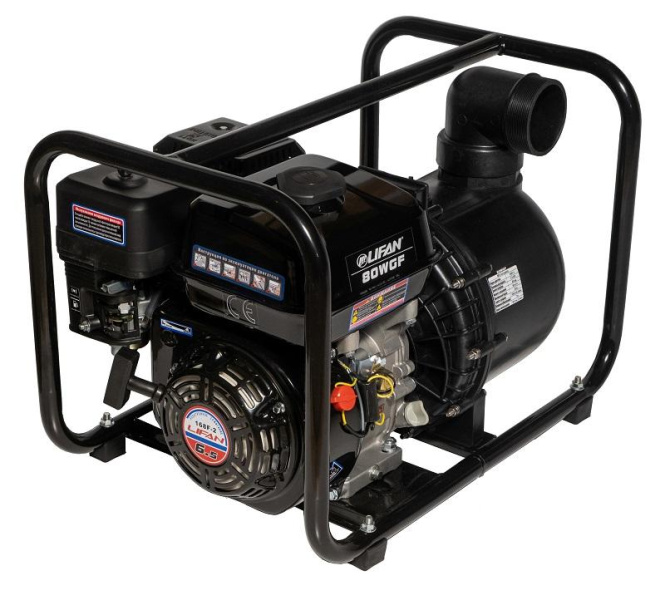 - Основной особенностью данной серии мотопомп является устойчивость работающих частей насоса к химически активным жидкостям. Достигается это путем использования в конструкции деталей, соприкасающихся с перекачиваемой жидкостью, специальных полимеров. Вследствие данной особенности конструкции насоса, мотопомпа прекрасно справляется с перекачиванием химически активных жидкостей свободных от примесей песка и других различных мелких фракций. Но обратной стороной химической устойчивости деталей насоса является их хрупкость по отношению к твердым фракциям (песок, мелкие твердые частицы, попадающиеся в жидкости), что существенно затрудняет использование мотопомпы на природных водоемах и источниках воды. Поэтому производитель рекомендует использовать мотопомпу Lifan 80WGF только для перекачивания жидкостей свободных от твердых примесей. Номинальная производительность мотопомпы (то есть объем жидкости, который она способна перекачать в единицу времени) это 60 кубических метров жидкости в час. Забор жидкости для перекачивания может осуществляться с глубины до 7 метров, а высота подъема забираемой жидкости достигает 20 метров. Время развертывания мотопомпы до рабочего состояния составляет всего 180 секунд. В мотопомпе используется, наверно самый популярный у Лифана, надежный и проверенный временем четырехтакный двигатель Lifan 168F-2 с воздушным охлаждением, один из лучших по соотношению цена - качество, компактных и экономичных агрегатов.