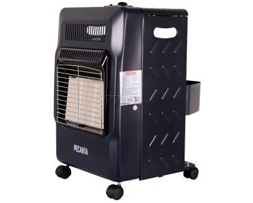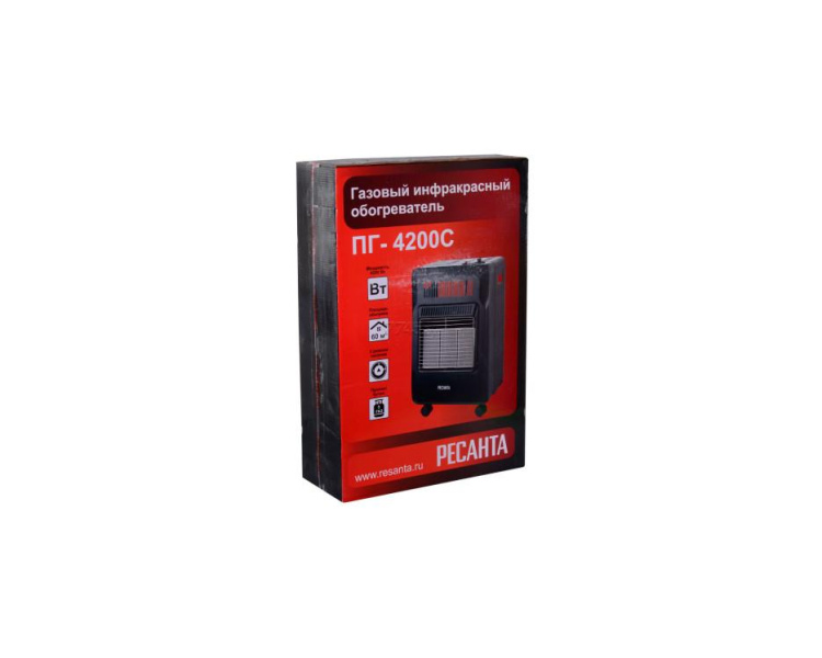 Обогреватель инфракрасный газовый РЕСАНТА ПГ-4200С (67/5/12) - работает на газовом топливе. Теплоотдача осуществляется преимущественно инфракрасным излучением. Данный газовый обогреватель безопасен, эффективен и надежен. Для работы в нём используется исключительно сжиженный газ (пропан, пропан-бутан). Емкости для газа поставляются отдельно. Обогреватель оснащён следующими системами безопасности: автоматическое отключение, если внезапно погаснет фитиль, автоматическое отключение при опрокидывании (в этом случае верните нагреватель в вертикальное положение, проверьте на наличие возможных повреждений и подождите 5-10 минут перед повторным зажиганием), автоотключение при получении ударов, автоматическое отключение, когда концентрация углекислого газа СО² в воздухе помещения достигает 0,8-1,5%. Способ поджига - пьезо. Место под установку баллона внутри устройства - 12 л.