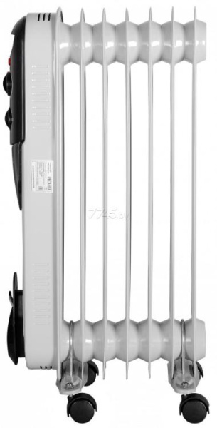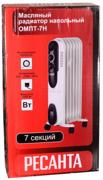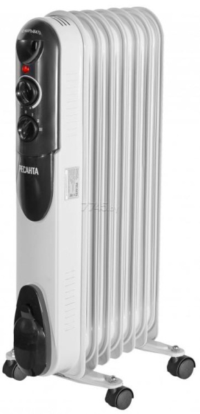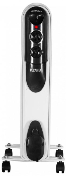 Обогреватель масляный РЕСАНТА ОМПТ-7Н (67/3/3) - предназначен для обогрева воздуха и создания комфортной атмосферы в холодное время года. В металлическом корпусе находится масло, нагреваемое до высокой температуры при помощи нагревательного элемента. Далее радиатор отдает тепло помещению. Масляный радиатор оснащен термостатом, что позволяет ему автоматически поддерживать в помещении заданную пользователем температуру. Существенным плюсом является и то, что он обладает низкой температурой корпуса, благодаря чему практически не выжигает кислород в помещении. Термостат без выбора конкретной температуры.