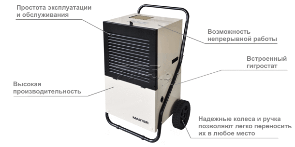 - Осушитель воздуха MASTER DH 772 (4512.461) применяется для снижения уровня влажности в помещении. Корпус изготовлен из прочного металла, прибор прост в эксплуатации и обслуживании. С помощью встроенного гигростата удобно регулировать относительную влажность воздуха. Модель оснащена баком для сбора конденсата с автоматическим закрытием при заполнении. Также есть возможность подсоединения шланга для отвода конденсата. Имеется воздушный фильтр.