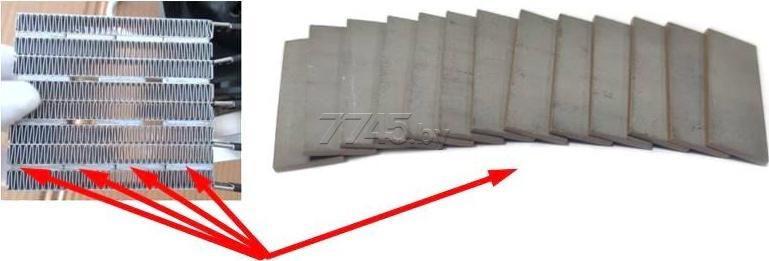 В нагревателе используется не классический Трубчатый Нагревательный Элемент (ТЭН), а керамические пластины Позисторы или PTC - элементы. Позисторы или PTC - элементы – это полупроводниковые керамические камни, изготовленные из поликристаллической керамики на основе титаната бария (BaTiO3) и характеризующиеся чувствительностью к температуре. Расположены они между металлическим теплообменником, для увеличения нагреваемой площади, улучшения КПД работы керамических пластин.