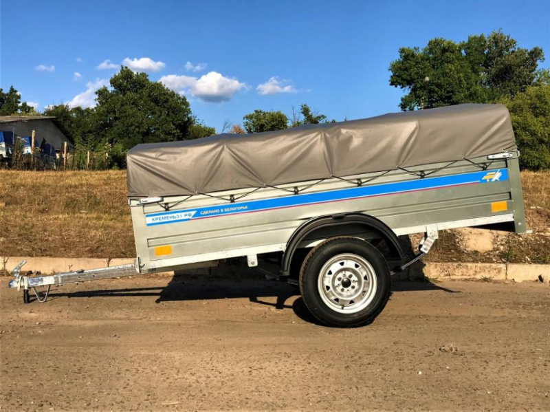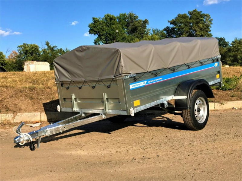 Прочные рессоры позволяют преодолевать любые ухабы на дороге без ущерба для груза. В комплект прицепа входит непромокаемый тент из ПВХ высотой 30 см от борта. Прицеп оборудован стандартным набором световых приборов, это комбинированные фонари, поворотники, стоп-сигнал, светоотражающий треугольник. Светотехника польской фирмы Fristom.