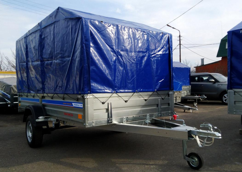 Прицеп комплектуется 4-х листовой рессорой Alko. На полу влагостойкая фанера толщиной 9 мм. Ступица ВАЗ-2108, амортизаторы ВАЗ 2101. Ось прицепа квадратного сечения, что увеличивает прочность по сравнению с осью круглого сечения. Прицеп оборудован стандартным набором световых приборов.