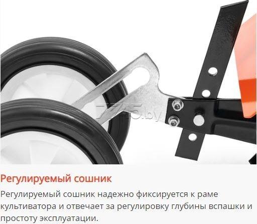 Регулируемый сошник надежно фиксируется к раме культиватора и отвечает за регулировку глубины вспашки и простоту эксплуатации.