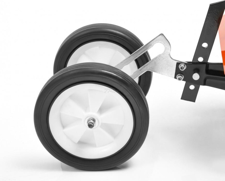 Двойные транспортировочные колеса обеспечивают дополнительную устойчивость агрегата при перемещении к рабочей зоне. Конструкция опоры позволяет за считанные секунды переключаться между рабочим и транспортировочным положениями