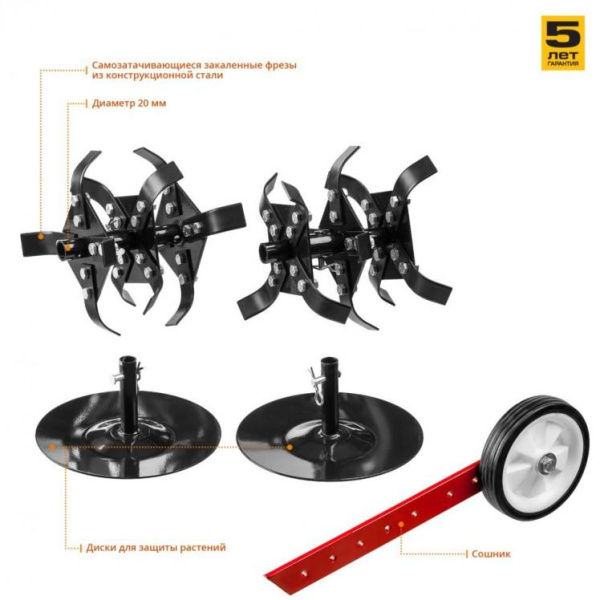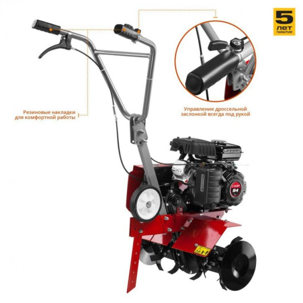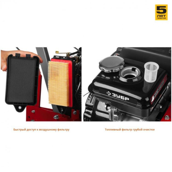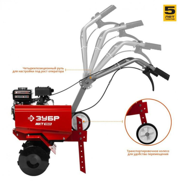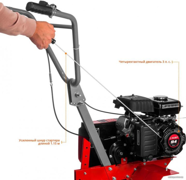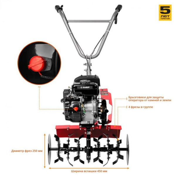 Надежный четырехтактный двигатель ЗУБР надежен в эксплуатации Рукоять культиватора с возможностью регулировки по вертикали делает управление более комфортным Наличие реверса значительно облегчает его эксплуатацию Цепной редуктор с закаленной осью диаметром 30 мм Сошник объединен с транспортировочными колесами для удобства перемещения до места работы не повреждая при этом газон или тротуарную плитку ножами На корпусе предусмотрен щиток, защищающий оператора от попадания земли Ременное сцепление способствует ровному передвижению без рывков Cамозатачивающиеся закаленные фрезы из конструкционной стали Защитный кожух ограничивает доступ к вращающимся частям клиноременной передачи и обеспечивает безопасность Регулируемый сошник надежно фиксируется к раме культиватора и отвечает за регулировку глубины вспашки Закаленные фрезы прекрасно закапываются на полную глубину и способствуют продвижению культиватора вперед