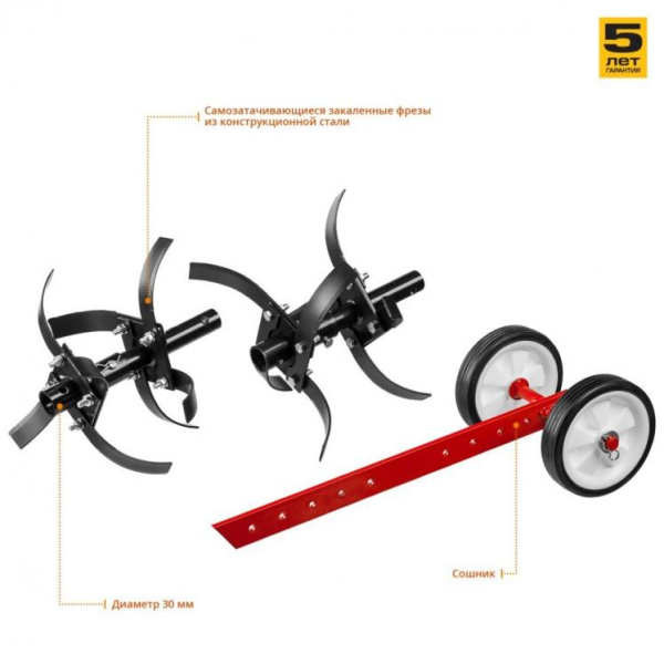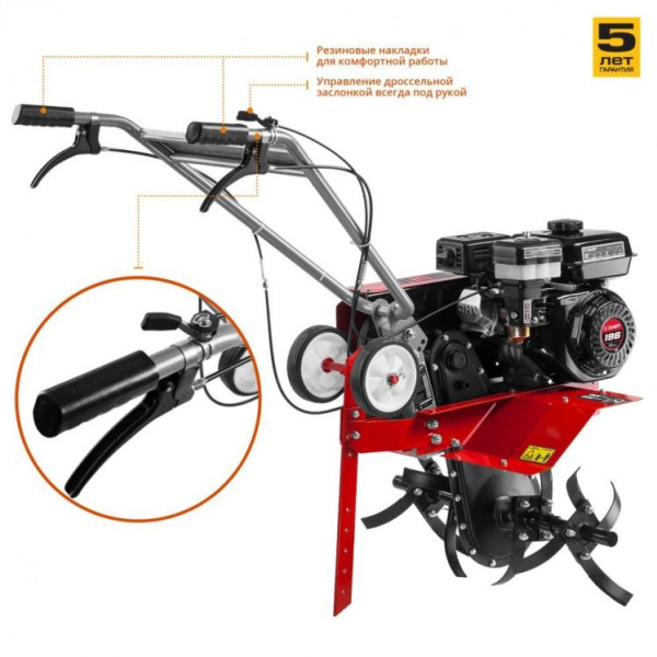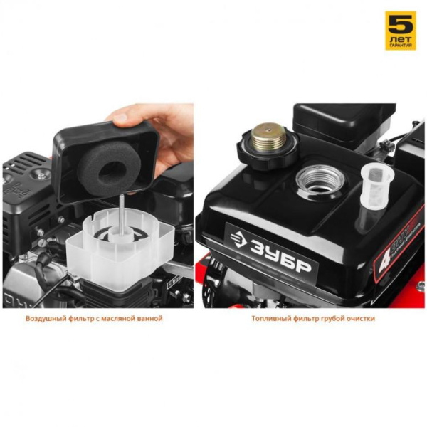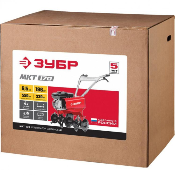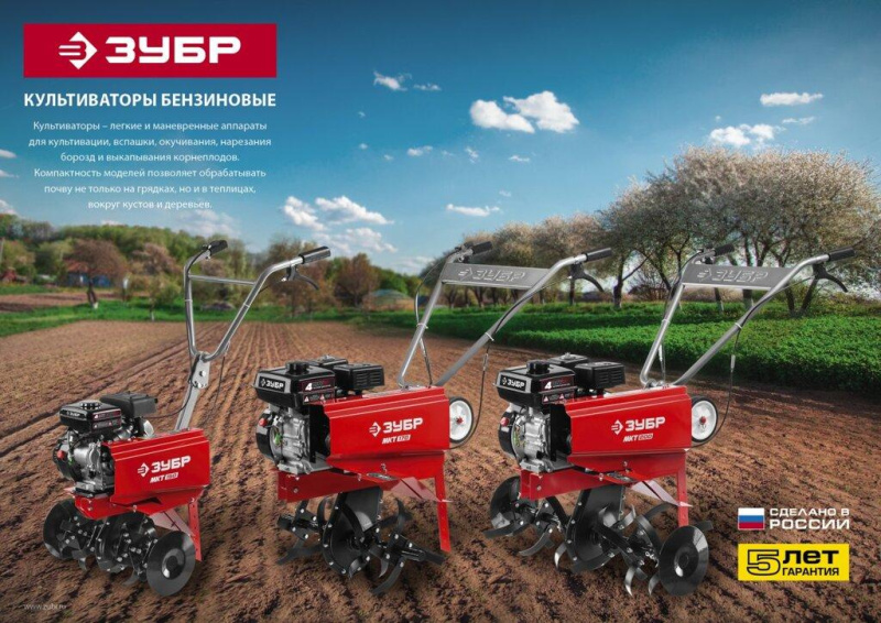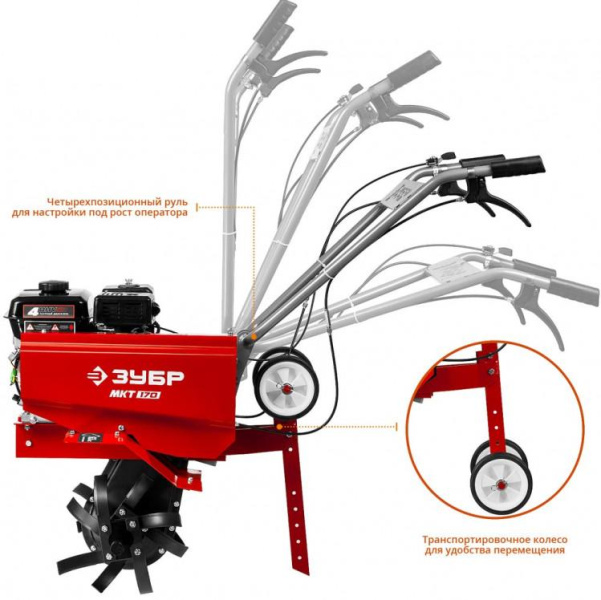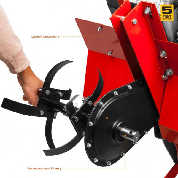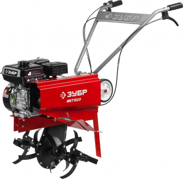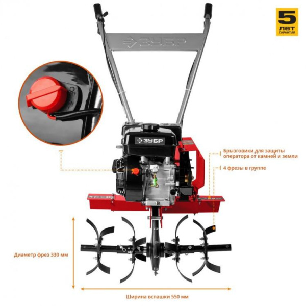 Надежный четырехтактный двигатель ЗУБР надежен в эксплуатации Рукоять культиватора с возможностью регулировки по вертикали делает управление более комфортным Наличие реверса значительно облегчает его эксплуатацию Цепной редуктор с закаленной осью диаметром 30 мм Сошник объединен с транспортировочными колесами для удобства перемещения до места работы не повреждая при этом газон или тротуарную плитку ножами На корпусе предусмотрен щиток, защищающий оператора от попадания земли Ременное сцепление способствует ровному передвижению без рывков Cамозатачивающиеся закаленные фрезы из конструкционной стали Защитный кожух ограничивает доступ к вращающимся частям клиноременной передачи и обеспечивает безопасность Регулируемый сошник надежно фиксируется к раме культиватора и отвечает за регулировку глубины вспашки Закаленные фрезы прекрасно закапываются на полную глубину и способствуют продвижению культиватора вперед