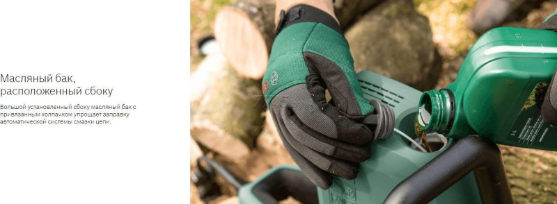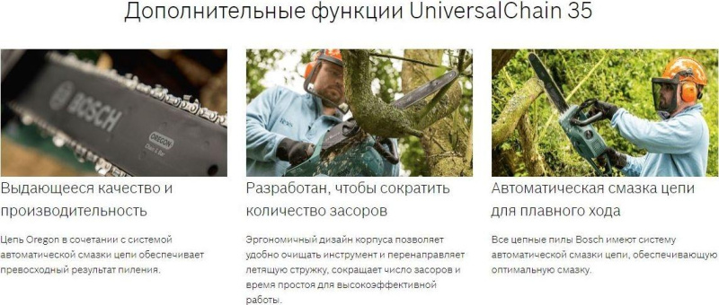 Пила цепная электрическая BOSCH Universal Chain 35 (06008B8300) с мощным электромотором, который практически не требует обслуживания и прост в эксплуатации. Скорость цепи 12 м/сек обеспечивает высокую производительность. Натяжение цепи производится без использования дополнительного инструмента с помощью удобно расположенного рычага с боку на корпусе пилы. Цепная пила Bosch UniversalChain 35 оснащена системой быстрой остановки цепи. обеспечивающей высокий уровень безопасности пользователя. Автоматическая смазка цепи гарантирует длительный срок эксплуатации пильной гарнитуры. Горловина бака для масла удобно расположена сбоку на корпусе. Зубчастый упор на торцевой части корпуса позволяет надежно фиксировать инструмент на заготовке во время работы. Уровень шума: 102 дБ.