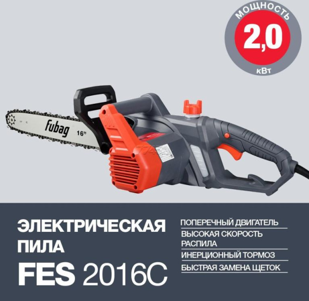 Пила цепная электрическая FUBAG FES2016C (31202) Оптимальный вариант для заготовки дров на приусадебном участке Удобный, легкий и безопасный инструмент для распилки древисины как на приусадебном участке, так и внутри помещения. Электропила оснащена поперечным двигателем высокой производительности, что при малой массе делает работу с ней легкой и максимально результативной. Высококачественные комплектующие гарантируют беспрецедентную надежность и долгий срок службы электропилы..