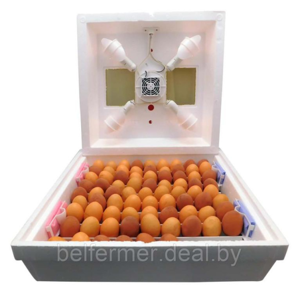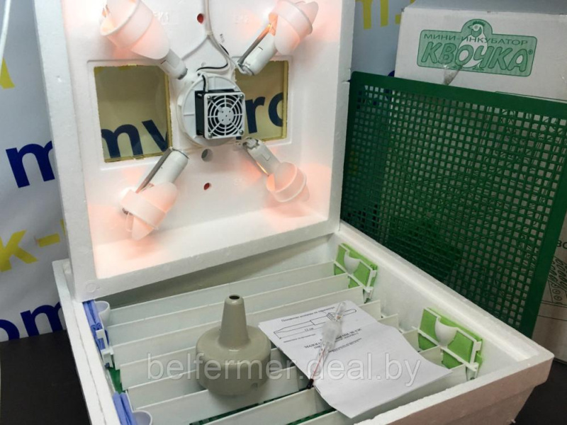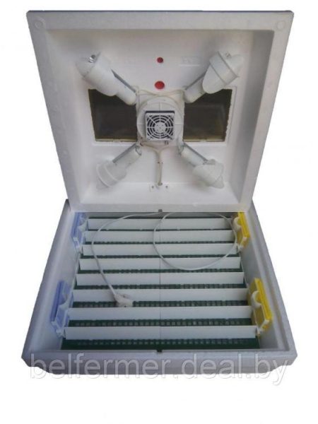 Внизу устройства имеются два водяных резервуара. Они, а также 8 вентиляционных отверстий обеспечивают вентиляцию и необходимую влажность воздуха. В крышке прибора находятся 2 обзорных окошка, предназначенных для визуального контроля за процессом инкубации. Внутри крышки расположен тэн, вентилятор и терморегулятор.