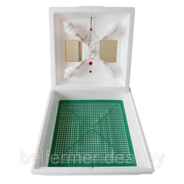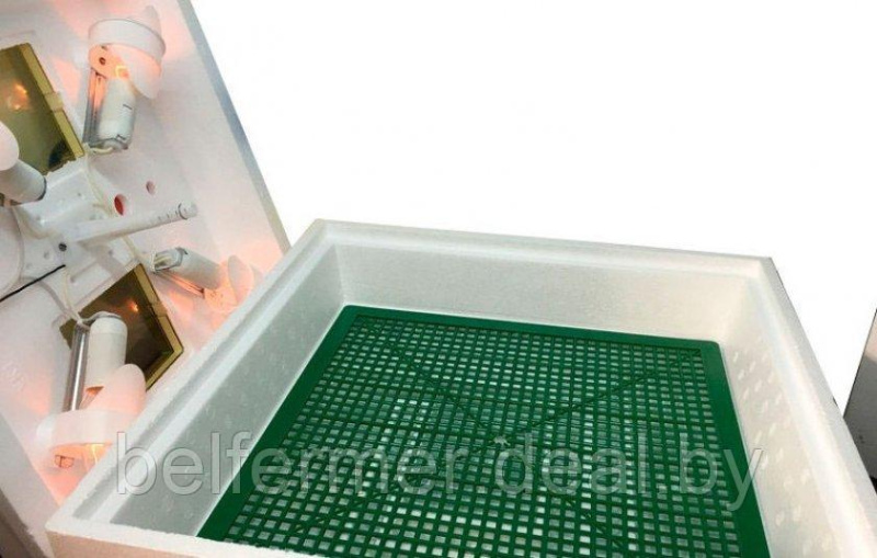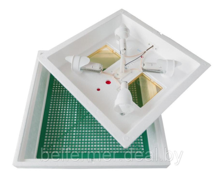 Внизу устройства имеются два водяных резервуара. Они, а также 8 вентиляционных отверстий обеспечивают вентиляцию и необходимую влажность воздуха. В крышке прибора находятся 2 обзорных окошка, предназначенных для визуального контроля за процессом инкубации. Внутри крышки расположены нагревательные лампы, прикрытые отражателями, и терморегулятор.