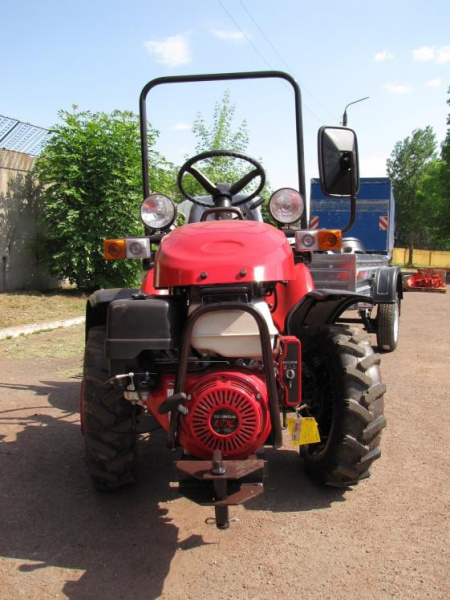Полный привод с принудительным включением заднего моста. Функция обеспечивает лучшее сцепление колес с поверхностью, проходимость техники в сыпучем и влажном грунте. Профессиональный японский двигатель Honda отличается высоким моторесурсом. Круглогодичное использование благодаря различному навесному оборудованию. Средства, потраченные на покупку техники, быстрее окупаются. 2 режима вращения ВОМ и наличие гидронавесного устройства позволяют агрегатировать техника как с сельскохозяйственной, так и с коммунальной навеской, активной и пассивной. Компактность. Небольшие размеры обеспечиваю трактору простоту управления и хорошую маневренность, что важно при работе на маленьких участках. Радиус разворота при минимальной величине колеи не превышает 2,5 м. Высокая проходимость. В стандартной комплектации модель оснащается шинами 210/75R13. Благодаря полному приводу, большим колесам и высокому клиренсу (280-300 мм) трактор успешно справляется с бездорожьем. Надежность и высокое качество. Трактор производится в Беларуси на Сморгонском агрегатном заводе. Техника соответствует европейским стандартам качества. Нормативный срок службы модели 6 лет.