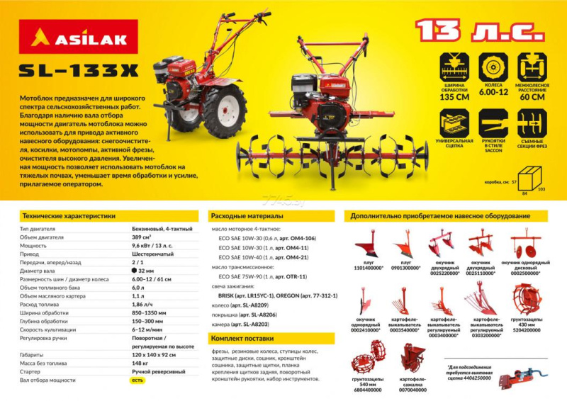 Мотоблок бензиновый ASILAK SL-133X (SL-133X) благодаря большому весу и мощному 4-тактному двигателю идеален для обработки целины. Большие колеса с глубоким протектором обеспечивают отличную проходимость и легкость управления. Универсальное сцепное устройство позволяет использовать абсолютно любое навесное оборудование, что значительно увеличивает удобство эксплуатации и функциональность. Подходят свечи BRISK: LR15YC; LR15YS; LR14YC.