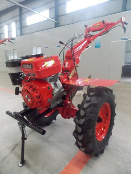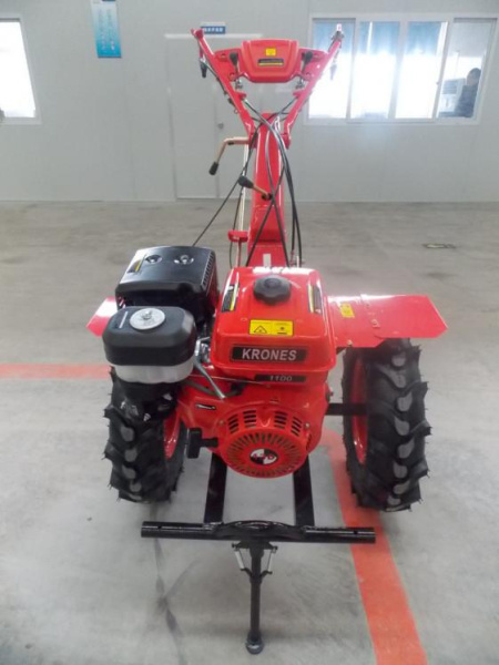 При помощи универсального крепления можно довешивать различные плуги и иное навесное оборудование. Рукоятка пользователя индивидуально регулируется. На нее вынесены все органы управления. Для задания нужной глубины культивации применяется специальный рычаг. Резиновые колеса с агрессивным протектором хорошо сцепляются с любой опорной поверхностью. Ширина обработки подбирается из интервала 80-110 см.Планируете купить мотоблок Krones 1100-16D (KM)?