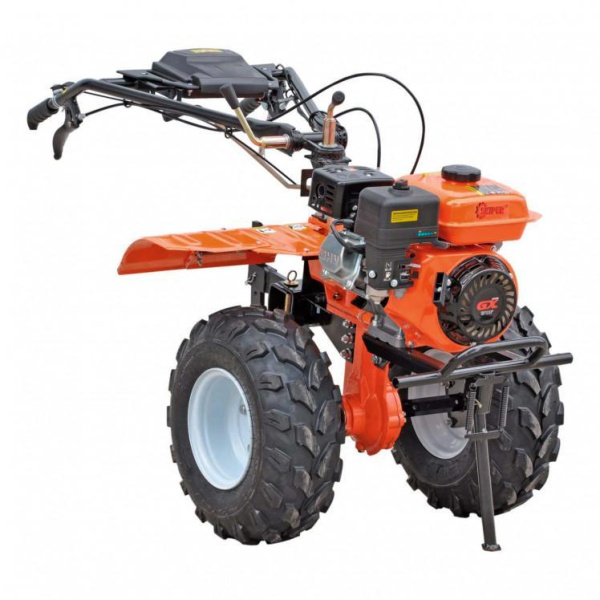 Пониженная передача для движения с минимальной скоростью и обеспечения максимального крутящего момента. 4-х скоростная коробка передач (3 вперёд, 1 назад). Надёжный и экономичный 4-х тактный бензиновый двигатель OHV с верхним расположением клапанов (аналог двигателя HONDA). Прочный чугунный корпус редуктора. Поворотная рукоятка с регулировкой по высоте. Универсальная сцепка "Русский тип" для присоединения различного навесного оборудования.Краткие характеристики: