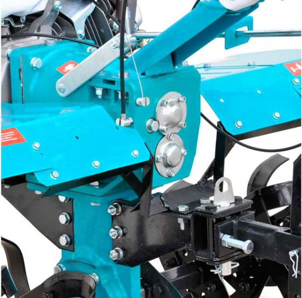 Регулируемая ширина обработки до 1050 мм, достигаемая благодаря фрезам, устанавливаемым вместо колес мотоблока. Глубина пахоты сошником также регулируется.