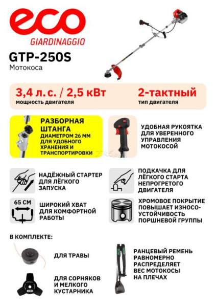 Мотокоса ECO GTP-250S Power (EC1515-3) с разборная штангой диаметр 26 мм (состоит из двух частей). Многофункциональная и эргономичная рукоятка велосипедного типа. Эффективная антивибрационная система. Использование улучшенного (усиленного) ручного стартера с системой лёгкий запуск. Цельнометаллический приводной вал. Редуктор повышенной прочности. Топливный бак с полупрозрачными стенками. Праймер (система лёгкого запуска). Ударопрочный корпус двигателя. Комбинированный защитный кожуху из прочного пластика. Усиленная полуавтоматическая косильная катушка с леской. Прочный трехлопастной нож. Двухплечный ремень для большего комфорта при работе. Два поршневых кольца для высокой компрессии.